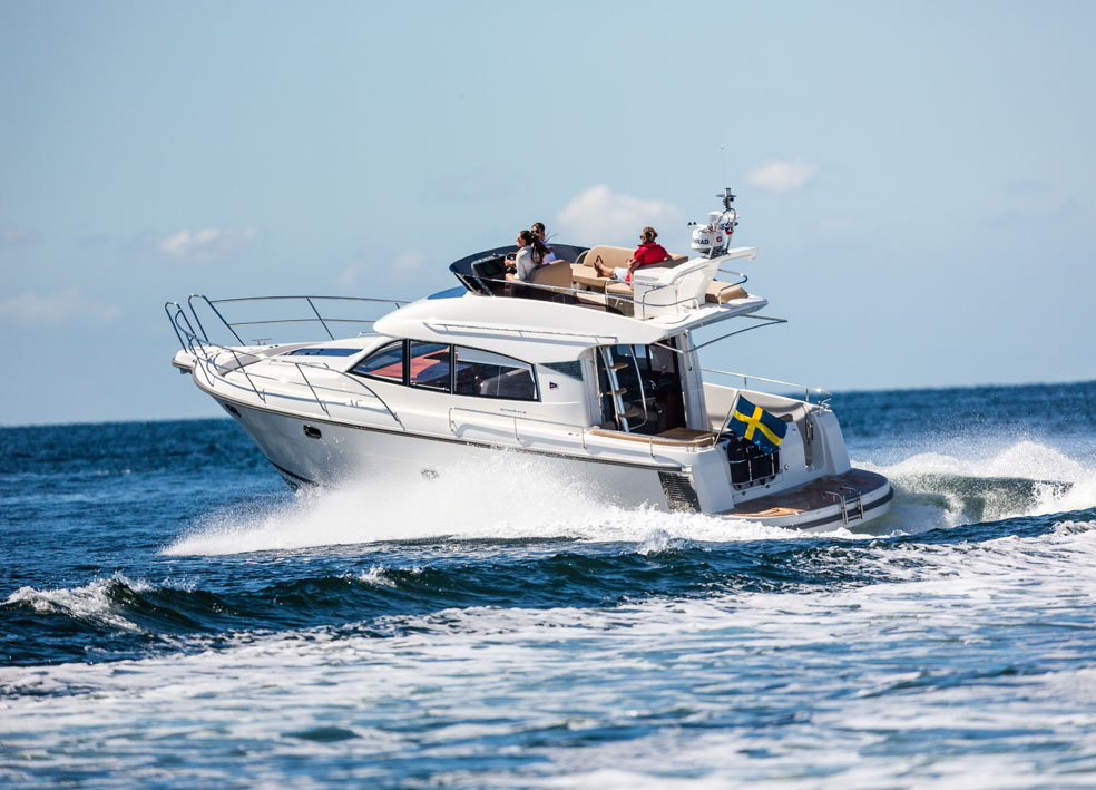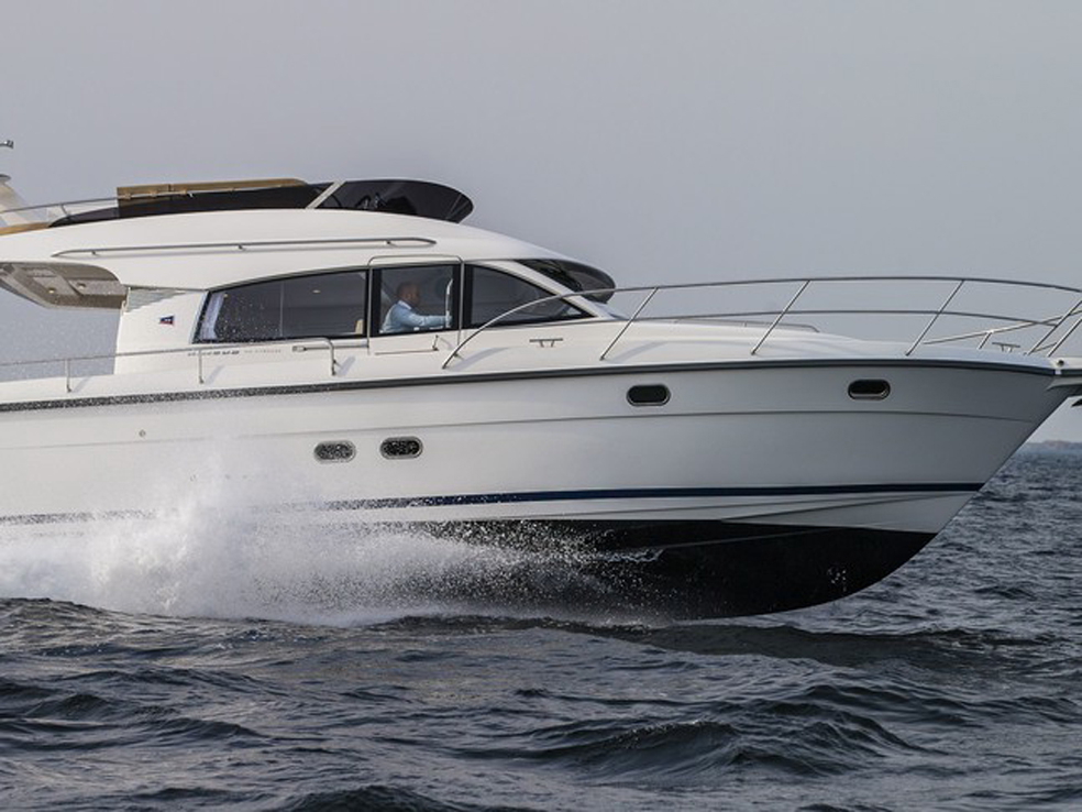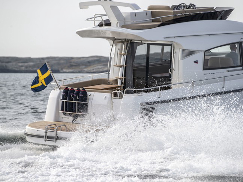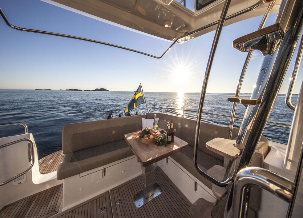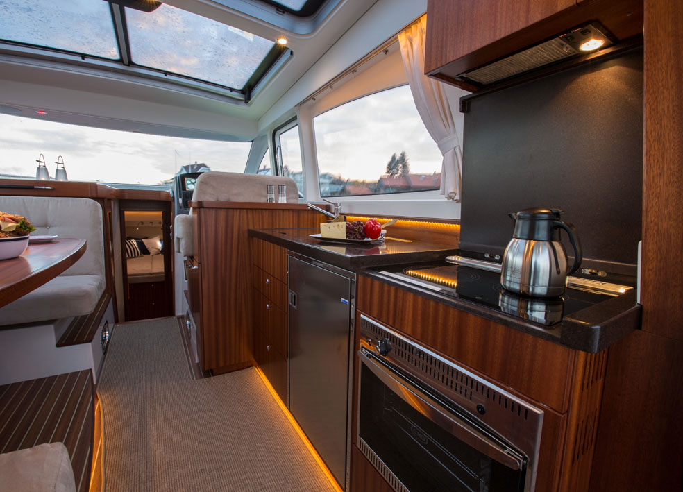 Beispielhaft dafür stehen die optionalen Zwillings-Touchscreen-Kartenplotter, vier Sitzplätze in Fahrtrichtung, eine neue D-Säule mit integrierter Be- und Entlüftung, eine komplett verglaste Tür vom Salon zum Achterdeck, ein elektrisch höhenverstellbarer Tisch mit Sonnenpolster auf dem Achterdeck, sowie eine großzügige, selbstlenzende Stauluke hinter dem Fenderkorb. Weitere herausragende Innovationen sind die neu gestalteten Motorraum-Entlüftungsgitter mit aktiver Entlüftung in den Rumpfseiten, die Küche mit dunkler Corean Arbeitsplatte inklusive Glasceran-Kochfeld und Backofen, sowie der 120-Liter Kühlschrank mit optionaler Tiefkühlbox unter dem Sofa.