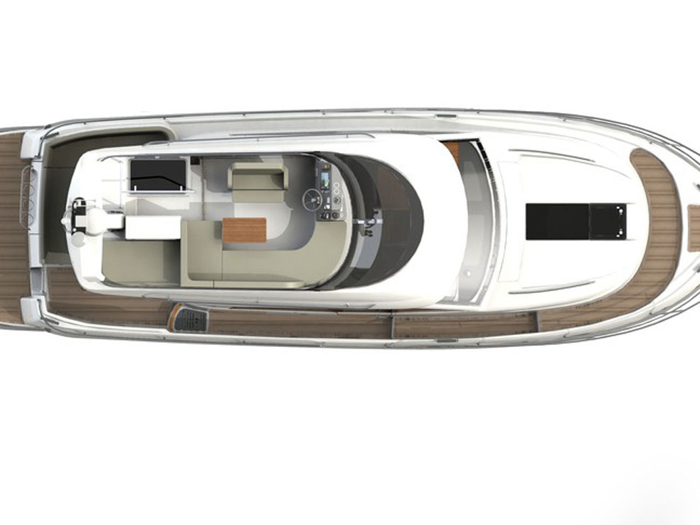 Die Flybridge beinhaltet eine “wet bar“, ausgerüstet mit Spüle, Grill und Kühlschrank, eine Sonnenliege, ein großes, bequemes Sofa sowie einen Doppelsitz. Der Sitz kann um 180 Grad gedreht werden. So entsteht mehr Platz für ein gemütliches Miteinander.
